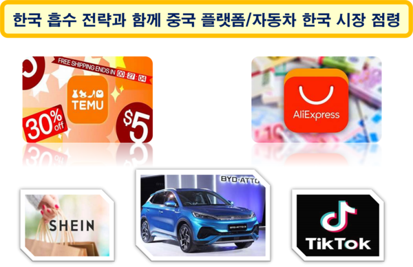 이러한 중국의 한국 흡수 전략과 함께 테무(TEMU), 알리익스프레스(AliExpress), 쉰(Shein) 등 중국의 전자상거래업체, 중국의 동영상 연예/대화방 틱톡(TikTok), 중국 전기차의 대명사 BYD 등이 잠식(蠶食) 수준을 넘어 파죽지세로 한국 시장을 점령하고 있다. 현재 중국의 한국 흡수 전략은 중국 정부가 국가 이름으로 수행하지 않고 인민을 통해 비공식적이고 비공개적으로 진행하는 일종의 소프트 파워(soft power) 전쟁이라 할 수 있다. 중국의 다수 인민은 정상적인 인격의 주체나 의사결정의 주체로 보기 힘들 정도로 중국 정부에 의해 매우 심각하게 세뇌(洗腦)되어 국가의 투사(鬪士)처럼 정부의 명령을 수행하는 것으로 판단된다. 인민들이 세뇌당한 내용 중에는 주요 흡수 대상 국가인 한국을 극도로 혐오하도록 하는 내용이 포함되어 있다는 것이다. 따라서 중국 업체가 대대적으로 제공하는 각종 홍보 사은품과 저가 상품의 홍수 속에서 우리가 헤어나지 못한다면 이 나라는 중국의 거대한 입속으로 빨려 들어가게 될 것이다.