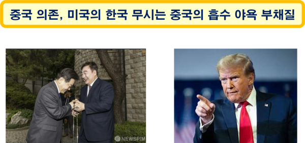 어차피 한국이 초강대국에 의지하며 살아가야 할 운명이라면 중국에 기대어 사는 것도 나쁘지 않다는 이재명 대통령의 야당 대표 시절 발언도 한국을 흡수하려는 중국을 도와주는 촉진제 역할을 할 것으로 판단된다. 나아가 한국을 마치 주권이 없는 국가처럼 경멸하듯 함부로 말하는 트럼프 대통령과 미국 정부의 태도 또한 중국의 한국 흡수 야욕에 긍정적인 변수로 작용할 가능성이 높다.