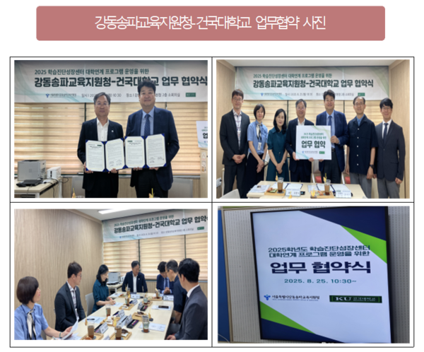 서울특별시강동송파교육지원청(교육장 조현석)은 8월 25일(월), 건국대학교(사범대 학장 유승공)과 기초학력 지원을 위한 상호협 력 업무협약(MOU)을 체결했다. 이번 협약은 지역대학과 연계한 기초학력 지원 및 학습 안전망을 강화하고, 강동송파학습진단성장센터 지역특화 프로그램 운영 협업을 위해 마련되었다.
