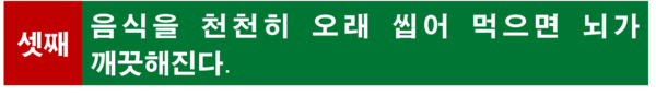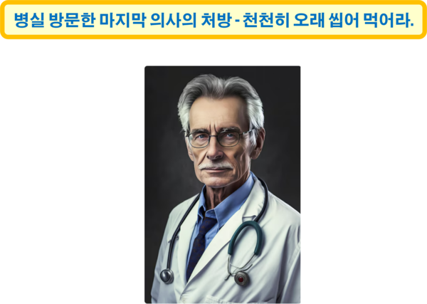 그날 한 의사가 병실을 방문했고, 그 의사의 처방은 놀랍게도 ‘천천히 오래 씹어서 먹어 보라.’는 것이었다. 평소 환자는 제대로 씹지도 않고 매우 빠르게 음식을 삼키는 식습관을 가지고 있었다. 환자는 반신반의하며 의사의 말대로 한 끼를 먹는데 1시간에서 2시간, 때로는 그 이상의 시간을 보내며 음식을 매우 천천히 꼭꼭 씹어서 삼키기 시작했고, 수개월 후 나타나기 시작한 특별한 변화 덕분에 생명을 건질 수 있었다. 그 당시에는 잘 알려지지 않았던 효과에 대하여 전문가를 통해 알아본다.