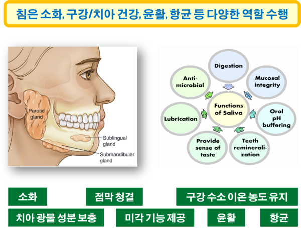 우리의 입 주변에 분포하고 있는 침샘에서 분비되는 소화액의 일종인 침은 소화, 점막(粘膜)의 청결 유지, 구강(口腔) 내 중성 또는 알칼리성 등 적정한 수소 이온 농도(PH) 조절, 치아에 광물성(; 미네날) 영양소 보충, 미각 기능 제공, 구강 내 윤활, 항균 등은 물론 녹말(綠末)을 맥아당(麥芽糖)으로, 맥아당을 포도당으로 바꾸는 작용을 한다. 침은 이러한 기본 작용 외에도 여러 가지 특별한 작용을 하는 것으로 알려져 있다.