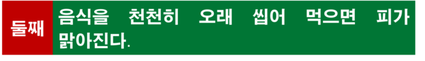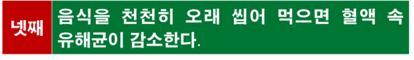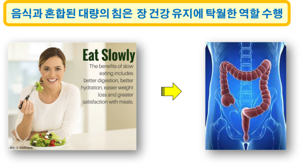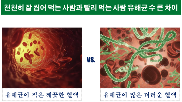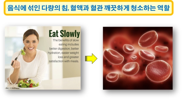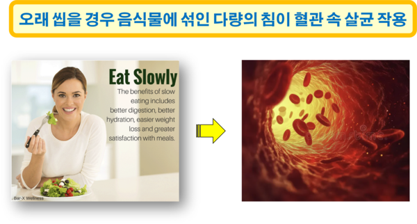 나쁜 음식을 많이 먹으면 나쁜 균들이 많아지는 것은 당연한 이치이다. 그런데 같은 음식이라도 천천히 오래 씹어서 먹는다면, 항균 작용을 하는 침이 음식에 충분히 섞인 후 몸속으로 흡수되면서, 유해균이 줄어드는 현상을 볼 수 있다. 결국 음식 속에 포함된 침이 혈액 속으로 들어가서 살균 작용을 하게 되는 것이다. 실제로 음식을 천천히 잘 씹어서 먹는 사람과 그렇지 않은 사람의 혈액 속 유해균의 수를 비교하여 보면 그 차이가 매우 크다는 사실을 쉽게 확인할 수 있다.
