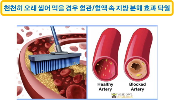 음식을 천천히 오래 씹을 경우 침샘에서 다량의 침이 분비되어 음식과 섞이게 되고, 음식에 섞인 다량의 침은 몸에 흡수되어 혈액과 혈관을 깨끗하게 한다. 침에는 시알산(sialic acid)이 포함되어 있기 때문이다. 침에 녹아 있는 시알산은 첫째, 적혈구, 백혈구, 혈소판과 같은 혈구(血球)가 서로 응집(凝集)하는 것을 막아줌으로써 혈액을 맑게 유지한다. 둘째, 침에 녹아 있는 시알산은 혈액이 혈관 벽에 달라붙는 현상을 막아줌으로써 혈관 벽을 깨끗하게 유지하고, 혈액순환을 원활하게 한다. 따라서 음식을 천천히 오래 씹어 먹을 경우 시알산 분비가 촉진되어 혈구가 응기거나 혈액이 혈관에 침착되는 현상이 줄어들어서 혈액순환이 원활하게 되고, 신진대사도 개선되게 되는 것이다.