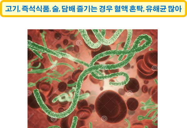 혈액을 관찰하다 보면 나쁜 세균이 유난히 많은 사람이 있다. 특히 고기나 즉석식품을 많이 먹거나, 술과 담배 등을 즐기는 사람의 혈액 속에는 유해균이 많고, 피가 혼탁하며, 지방이 많이 녹아 있는 모습을 확인할 수 있다.