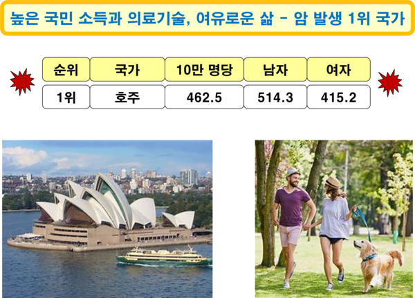 2024년 국립암센터가 발표한 2022년 기준 암 발생 국가를 순위별로 보면, 1위가 호주로, 암 환자는 인구 10만 명당 462.5명이다. 남자는 514.3명, 여자는 415.2명으로, 남자가 여자보다 암 발병률이 더 높다. 국민 소득(61,341달러) 수준과 의료기술 수준이 높고, 세계에서 가장 질 좋은 음식을 가장 여유롭게 즐길 수 있는 여건을 갖추고 있는 나라이지만, 암 발생 비율은 세계에서 제일 높다. 호주는 비만 문제가 매우 심각한 국가로, 2007년 기준 호주 내 비만은 "전염병" 수준으로 평가되고 있으나, 발표된 통계가 거는 없는 실정이다. 220가지 종류로 구성된 60조 개 내외의 우리 몸 세포가 건강하고 튼튼하게 유지되게 하기 위해서는, 근심과 걱정이 전혀 없는 아주 편안한 상태가 아니라, 적정한 수준의 육체적/정신적 긴장이 지속되어야 한다는 전문가의 충고를 명심해야 한다.