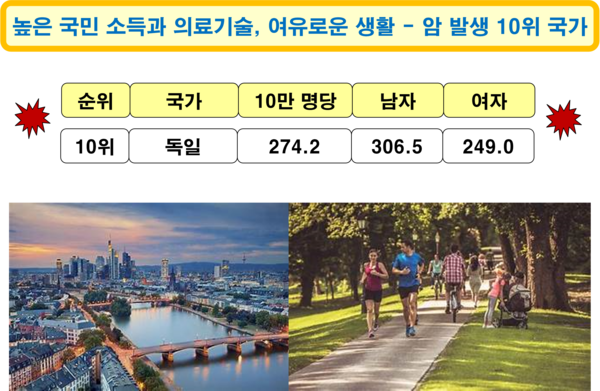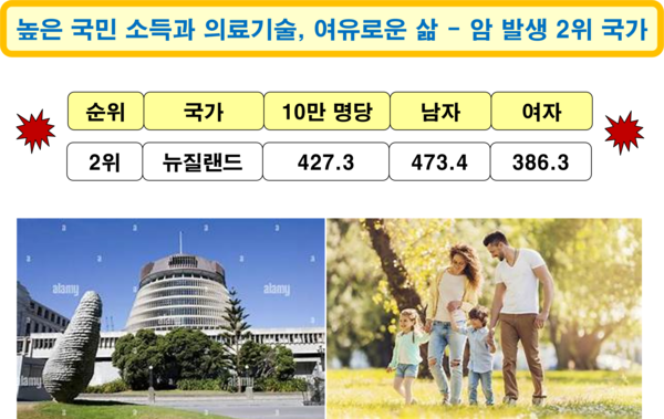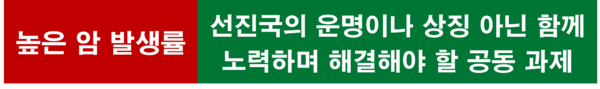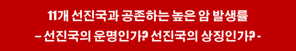 이상 소개한 암 발생 상위 11개 국가는 세계적으로 가장 잘 알려진 선진국들이다. 1인당 국민소득 수준과 의료기술 수준이 높고, 선진 음식문화를 가지고 있으며, 불량식품에 대한 규제와 암 예방과 치료를 위한 노력도 체계적으로 이루어지고 있는 나라들이다. 이렇듯 세계 최고 수준의 선진국들에서 암이 집중적으로 발생하는 현상이 이들 국가의 운명이나 상징이 되어서도 안 된다. 정부의 지속적 노력은 물론 풍요 속에 살아가는 국민 각자의 개인적인 식생활과 일상생활에 획기적인 변화가 있다면 암 문제의 해결이 가능할 것이다. 그나마 다행스러운 일은 우리나라의 암 사망률이 인구 10만 명당 77.0명으로 주요 비교 국가 중에 가장 낮은 암 사망률을 보였다는 것이다. (식문화 원문 : 네이버 AI 브리핑. 그림 : 야후)