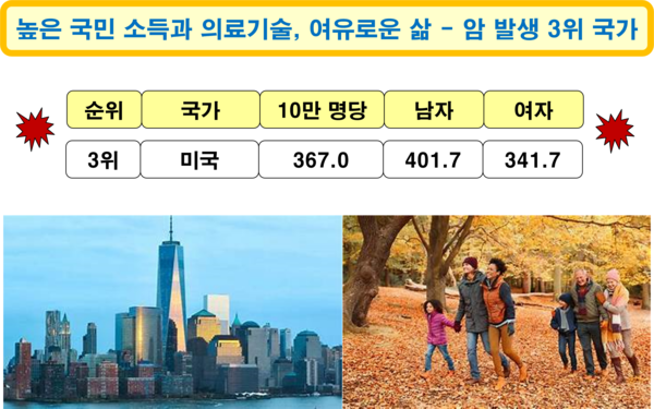 2022년 기준 미국의 암 발생 국가 순위는 3위로, 암 환자는 인구 10만 명당 367.0명이다. 남자는 401.7명이고, 여자는 341.7명으로, 남자가 여자보다 암 발병률이 더 높다. 국민 소득(6만 5,020달러) 수준과 의료기술 수준이 매우 높고, 질 좋은 음식을 여유롭게 즐길 수 있는 여건을 갖추고 있는 나라이지만, 암 발생 비율은 세계에서 세 번째로 높다. 최근 비만이 암 발생에 원인이 되거나 암 발생 위험을 높인다는 사실을 부정하는 사람은 거의 없다. 문제는 모든 선진국들이 비만 문제로 고민하고 있다는 것이다. 특히 미국의 경우, 2023년 기준으로 성인 인구의 45.6% 또는 그 이상이 비만[BMI(; Body Mass Index, 체질량 지수) 30 이상]으로, 세계 최고 수준이며, 고도비만 비율은 9.7%에 이른다. 물론 비만이 아니더라도 지나친 안락은 우리 몸 세포를 약화시키고 세포 변이를 촉진함으로써 암 발생을 재촉할 수 있음은 이미 여러 차례 강조한 바 있다.