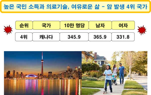 2022년 기준 캐나다의 암 발생 국가 순위는 4위로, 암 환자는 인구 10만 명당 345.9명이다. 남자는 365.9명이고, 여자는 331.8명으로, 남자가 여자보다 암 발병률이 더 높다. 국민 소득(44,388달러) 수준과 의료기술 수준이 높고, 질 좋은 음식을 즐길 수 있는 여건을 갖추고 있는 나라이지만, 암 발생 비율은 세계에서 네 번째로 높다. 캐나다 성인 인구의 약 32.7%가 비만 상태이며, 이는 2009년 이후 약 8%포인트 증가한 수치이다. 특히 2023년 기준, 18세 이상 캐나다인 중 3분의 1이 비만에 해당하며, 코로나 기간 동안 비만율이 더욱 가파르게 증가했다.
