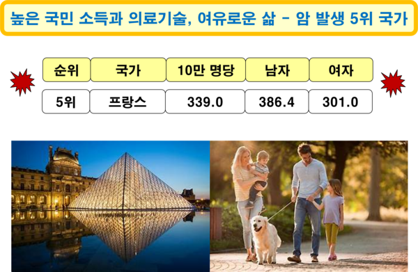 2022년 기준 프랑스의 암 발생 국가 순위는 5위로, 암 환자는 인구 10만 명당 339.0명이다. 남자는 386.4명이고, 여자는 301.0명으로, 남자가 여자보다 암 발병률이 더 높다. 국민 소득(38,976달러) 수준과 의료기술 수준이 높고, 세계 최고의 음식을 즐길 수 있는 여건을 갖추고 있는 나라이지만, 암 발생 비율은 세계에서 다섯 번째로 높다. 2020년 기준 프랑스 성인 인구의 47.3%가 과체중 또는 비만에 해당한다. 여성 비만율이 남성보다 높게 나타났으며, 특히 젊은 층에서 그 증가세가 두드러진다.