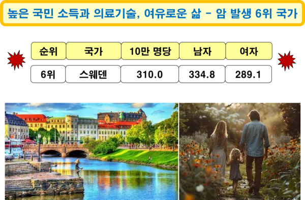 2022년 기준 스웨덴의 암 발생 국가 순위는 6위로, 암 환자는 인구 10만 명당 310.0명이다. 남자는 334.8명이고, 여자는 289.1명으로, 남자가 여자보다 암 발병률이 더 높다. 국민 소득(55,521달러) 수준과 의료기술 수준이 높고, 질 좋은 음식을 여유롭게 즐길 수 있는 여건을 갖추고 있는 나라이지만, 암 발생 비율은 세계에서 여섯 번째로 높다. 스웨덴의 비만 문제는 성인 인구의 50% 이상이 과체중 또는 비만일 정도로 심각하다. 코로나 기간 동안 4세 어린이의 병적 비만 비율이 30% 증가했을 정도로, 최근에는 어린이 비만율도 사회적 문제로 부각되고 있다.