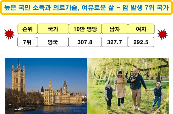 2022년 기준 영국의 암 발생 국가 순위는 7위로, 암 환자는 인구 10만 명당 307.8명이다. 남자는 327.7명이고, 여자는 292.5명으로, 남자가 여자보다 암 발병률이 더 높다. 국민 소득(47,005달러) 수준과 의료기술 수준이 높고, 질 좋은 음식을 즐길 수 있는 여건을 갖추고 있는 나라이지만, 암 발생 비율은 세계에서 일곱 번째로 높다. 영국은 2018년 기준 성인 인구의 약 30%가 비만일 정도로 매우 심각한 사회·보건 문제로, 정부와 의료계가 적극적으로 대응하고 있다. 2050년에는 영국인의 절반이 비만일 것으로 추정되며, 이로 인해 의료비 부담이 연간 450억 파운드[전체 NHS(국민건강보험) 예산의 절반 이상]까지 증가할 수 있다고 한다.