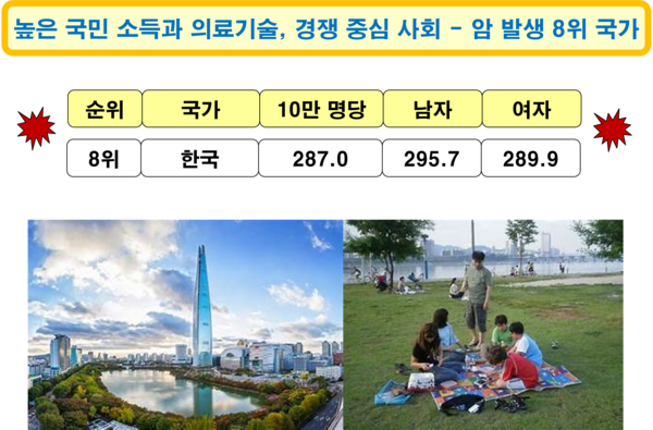 2022년 기준 한국의 암 발생 국가 순위는 8위로, 암 환자는 인구 10만 명당 287.0명이다. 남자는 295.7명이고, 여자는 289.9명으로, 남자가 여자보다 암 발병률이 더 높다. 국민 소득(3만 6,624달러) 수준과 의료기술 수준이 높고, 질 좋은 음식을 즐길 수 있는 여건을 갖추고 있는 나라이지만, 암 발생 비율은 세계에서 여덟 번째로 높다. 한국은 2022년 기준 19세 이상 국민 중 37.2%가 비만이다. 비만 유병률은 최근 10년간 꾸준히 증가 추세이며, 특히 청소년 비만율도 빠르게 늘고 있어, 향후 비만 인구 증가가 우려된다. 비만으로 인한 사회경제적 손실은 2010년 4조 8,000억 원에서 2015년 9조 2,000억 원으로 약 2배 증가했다.