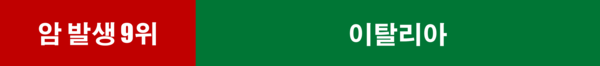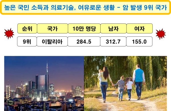 2022년 기준 이탈리아의 암 발생 국가 순위는 9위로, 암 환자는 인구 10만 명당 284.5명이다. 남자는 312.1명이고, 여자는 155.0명으로, 남자가 여자보다 암 발병률이 2배 이상 높다. 국민 소득(33,774달러) 수준과 의료기술 수준이 높고, 질 좋은 음식을 여유롭게 즐길 수 있는 여건을 갖추고 있는 나라이지만, 암 발생 비율은 세계에서 아홉 번째로 높다. 다행히 이탈리아는 유럽에서 비만율이 가장 낮은 국가 중 하나로, 이는 지중해식 식단과 건강한 생활 습관, 통곡물 위주의 식단, 가족과 함께하는 식사 문화 등이 주요 비결로 꼽힌다.