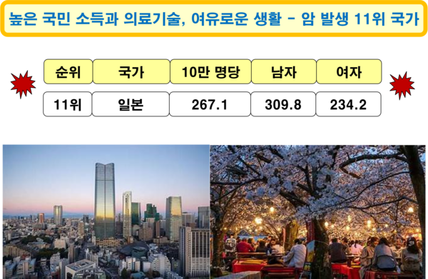 2022년 기준 일본의 암 발생 국가 순위는 11위로, 암 환자는 인구 10만 명당 267.1명이다. 남자는 309.8명이고, 여자는 234.2명으로, 남자가 여자보다 암 발병률이 더 높다. 국민 소득(3만 4,500달러) 수준과 의료기술 수준이 높고, 질 좋은 음식을 즐길 수 있는 여건을 갖추고 있는 나라이지만, 암 발생 비율은 세계에서 열한 번째로 높다. 일본은 세계에서 비만율이 매우 낮은 국가 중 하나로, 2020년 기준 성인 비만율이 4.0%에 불과해 25명 중 1명만이 비만으로 분류된다. 2009년부터 공공기관, 대기업 근무자 중 40세 이후 복부비만(남성 35.4인치, 여성 31인치 초과) 시 벌금 부과 등 ‘비만 금지법’이 시행되고 있다. 최근 서양식을 즐기는 젊은이들 사이에 비만 인구가 빠르게 증가하고 있다.