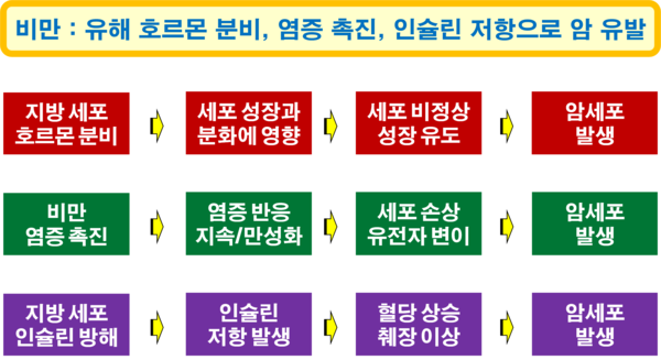 비만은 특히 3가지 측면에서 암 발생에 원인이 되거나 암 발생 위험을 높이고 있다. 첫째, 비만은 호르몬 불균형을 초래한다. 지방 세포에서 생성되는 여러 가지 유해 호르몬은 세포의 성장과 분화에 영향을 미칠 수 있다. 이러한 영향은 세포가 비정상적으로 성장하도록 유도할 수 있고, 결국은 암세포의 발생으로 이어질 수 있다. 둘째, 비만은 염증을 촉진한다. 비만에 의한 만성 염증은 암 발생의 중요한 원인 중 하나로 알려져 있다. 체내 염증 반응이 지속되면 세포 손상과 유전자 변이가 일어날 가능성이 높아져 암세포의 발생으로 이어질 수 있기 때문이다. 셋째, 비만은 인슐린 저항을 유발할 수 있다. 포도당을 세포에 주입하는 기능을 수행하는 인슐린의 작용을 지방 세포가 방해할 수 있고, 이러한 현상을 인슐린 저항이라고 한다. 인슐린 저항이 지속될 경우 혈당 수치가 높아지고, 인슐린을 분비하는 췌장에도 이상이 생기면서, 암이 발생할 수 있게 된다. (원문 출처 : 네이버 블로그 - 비만과 암 발생의 연관성)