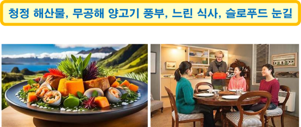 뉴질랜드 음식 문화는 마오리 전통, 유럽식, 아시아식 등 다양한 문화가 융합된 것이 특징이며, 요리에는 신선한 자연 재료와 해산물, 양고기, 유제품 등이 풍부하게 활용된다. 뉴질랜드는 느린 식사를 즐기며 느긋한 삶의 가치를 추구하고, 지역 농가와의 협력으로 신선한 재료를 사용하여 독특한 식문화를 형성하고 있다. 패스트푸드(fast food)보다는 지역 농가와 협력한 슬로푸드(slow food)와 현지에서 생산된 식재료를 강조하는 식문화가 발달해 있다.