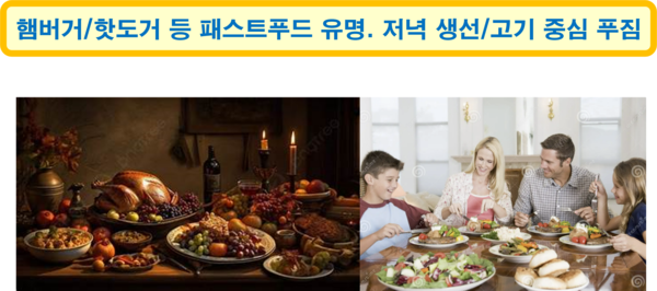 미국의 식문화는 다양한 민족과 지역의 음식이 융합된 다문화적 특성을 지니며, 패스트푸드(fast food)와 육류 중심의 식단이 대표적이다. 햄버거, 핫도그, 피자, 타코, 한식 등 세계 각국의 음식이 미국식으로 재해석되어 대중화된 것이다. 아침에는 토스트, 시리얼, 달걀, 과일 주스, 점심은 샌드위치나 햄버거, 저녁은 고기와 생선 중심의 푸짐한 식사가 일반적이다. 최근에는 저염, 저당, 저열량 등 건강을 고려한 식단이 확산되고 있으며, 웰빙(wellbeing), 완전한 채식주의자를 의미하는 비건(vegan), 일반적인 채식, 유기농 식품 등도 인기를 끌고 있다.