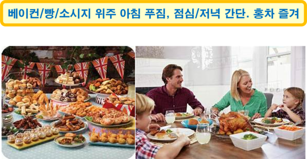 영국 식문화는 전통과 현대가 어우러진 특징을 지니며, 아침을 푸짐하게 먹고 점심과 저녁을 간단하게 먹는 전통이 있다. 영국의 아침 식사는 잉글리시 브렉퍼스트(English Breakfast)가 대표적이며, 베이컨, 달걀, 토마토, 버섯, 빵, 버터, 소시지 등으로 구성된다. 현대에는 빵이나 시리얼 등 간소한 메뉴도 선호하지만, 주말에는 전통적인 아침 식사를 즐기는 편이다. 홍차는 영국인의 일상 음료로, 아침/오후/저녁에 즐긴다. 애프터눈 티(afternoon tea)는 스콘, 샌드위치, 케이크와 함께 차를 마시는 전통이다. 최근에는 커피 소비도 늘고 있다.