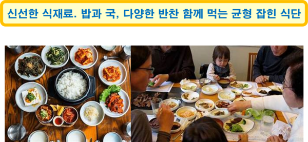 한국 식문화는 밥과 국, 다양한 반찬을 한 상에 차려 함께 먹는 ‘밥상 문화’가 중심이다. 한식은 신선한 채소, 해산물, 콩, 김치/된장/고추장 등 발효식품과 조미료를 활용한 복합적이고 다양한 맛이 특징이다. 구이, 전, 조림, 볶음, 찜 등 여러 가지 조리법을 활용해 균형 잡힌 영양식 식단을 제공한다. 최근에는 치킨 등 배달 음식의 대중화, 쌀 소비 변화, 식품 산업의 AI/디지털화가 새로운 동향이 되고 있다.