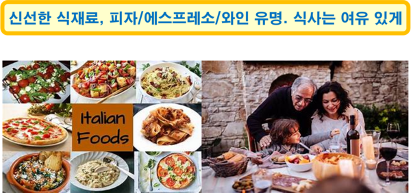이탈리아 식문화는 신선한 재료와 지역별 특색, 가족/친구와의 공유를 중시하며, 단순한 재료로도 깊은 맛을 내는 것이 특징이다. 파스타, 피자, 젤라토, 에스프레소, 와인, 올리브 오일 등이 이탈리아 식문화의 핵심이다. 요리에는 토마토, 치즈(모차렐라, 파르미자노 등), 해산물, 허브(herb), 올리브 오일 등이 지역별로 다양하게 활용된다. 식사는 천천히 여유있게, 주로 가족이나 친구와 함께 즐기며, 급하게 먹거나 걸으면서 먹는 것은 무례하게 여겨진다.