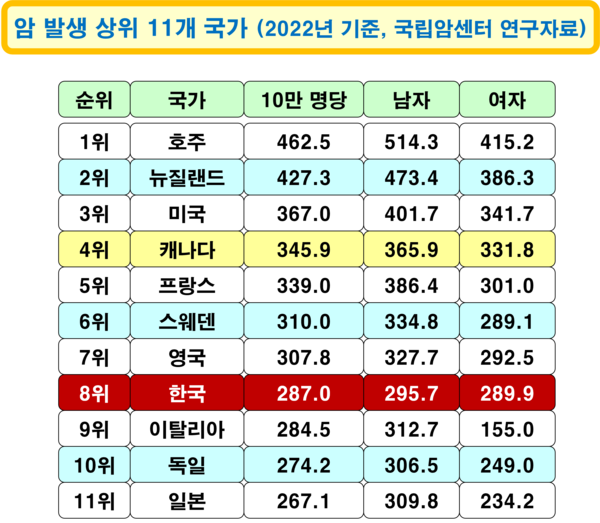 지난해(2024년) 우리나라 국립암센터가 발표한 연구자료에 의하면 2022년 기준 암 발생 상위 11개 국가는 위의 표에서 보는 것처럼, 지상낙원이라고 하는 국가들을 포함하여, 가장 대표적인 선진 국가들이다. 인구 10만 명당 암 환자 수는 1위 호주 462.5명, 2위 뉴질랜드 427.3명, 3위 미국 367.0명, 4위 캐나다 345.9명, 5위 프랑스 339.0명이고, 우리나라는 8위로 287.0명이다. 11개 국가의 식생활에 관한 문화, 국민소득, 의료기술 등을 국가별로 개략적으로 살펴보면 다음과 같다.