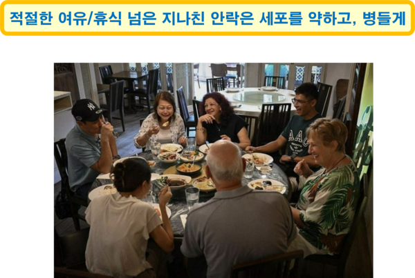 뉴질랜드는 식사를 천천히 하며, 여유 있는 삶을 즐기는 나라이다. 음식을 천천히 오래 씹어서 먹을 경우 1) 장이 좋아지고, 2) 피가 맑아지며, 3) 뇌가 깨끗해지고, 4) 혈액 속의 유해균이 감소한다는 사실은 [원인과 이유를 알 수 없는 질환에 특효약]이라는 글에서 언급한 바 있다. 다만, 육체적/정신적 활동을 줄이고, 편안하게 음식을 즐기며, 몸과 마음의 긴장을 느끼지 않게 하는 일상은 오히려 우리 몸 세포에 해가 될 수 있다. 몸과 마음의 긴장을 풀어주고 피로를 없애주는 휴식은 건강에 좋지만, 호주의 사례에서 강조한 바와 같이 몸과 마음의 활동을 중지할 정도의 지나친 안락은 우리 몸 세포를 도리어 약하게 만들고, 병들게 할 수 있다.