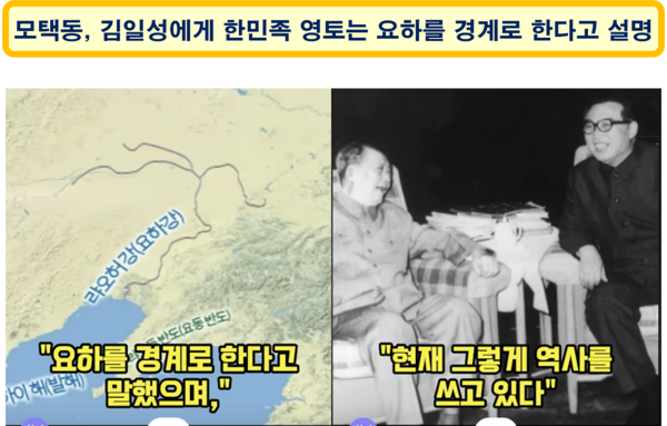 1958년 11월, 모택동(毛澤東; 1893~1976)은 김일성을 만난 자리에서 김일성에게 “당신들 선조는 당신들의 영토가 요하(遼河)를 경계로 한다.”고 말했으며, “우리 중국 선조들이 당신들의 요동(遼東) 땅을 침략해 당신들이 압록강변까지 밀려났다고 생각한다. 당신들은 이걸 당신들 역사에 써넣어야 한다.”라고 말했다. 그러자 김일성은 “현재 그렇게 역사를 쓰고 있습니다.”고 답했다.