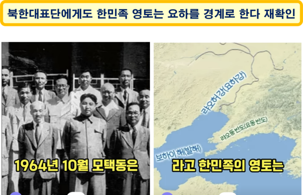 이 뿐만 아니라, 1964년 10월 모택동은 베이징을 방문한 북한대표단에게도 “당신들의 영토 경계는 요하 동쪽인데, 봉건주의가 조선사람들을 압록강변으로 내몰았다.”라고 말하며, 한민족의 영토는 요하를 경계로 한다는 것을 다시 한번 강조했다.
