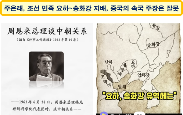 모택동과 함께 중국 공산당의 핵심 인물이었던 주은래(周恩來; 1898~1976) 역시 1963년 6월 북한과학원대표단에게 “조선 민족은 조선 반도와 동북 대륙에 진출한 뒤 오랫동안 거기서 살았다. 요하(遼河), 송화강(松花江) 유역에는 모두 조선 민족의 발자취가 남아있다. 두만강, 압록강 서쪽은 역사 이래 중국 땅이었으며, 심지어 예로부터 조선은 중국의 속국이었다는 말은 터무니 없다.”라고 말했다.