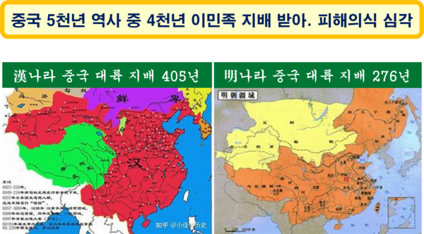 5천년 동안 순수 한족이 중국 대륙을 지배한 기간은 한나라 405년(전한 B.C.202~A.D.8, 후한 A.D.25~220), 명나라 276년(1368~1644)으로 최대 681년이다. 한족은 5천년 역사 중에 4천년 이상을 선비족, 거란족, 몽골족, 여진족(; 1635년 만주족), 돌궐족, 흉노족 등 이민족으로부터 지배를 받아왔다. 중국은 이민족에 대한 피해의식 때문에 강할 때 세계를 정복하려는 야욕을 가지고 있는 것으로 판단된다.