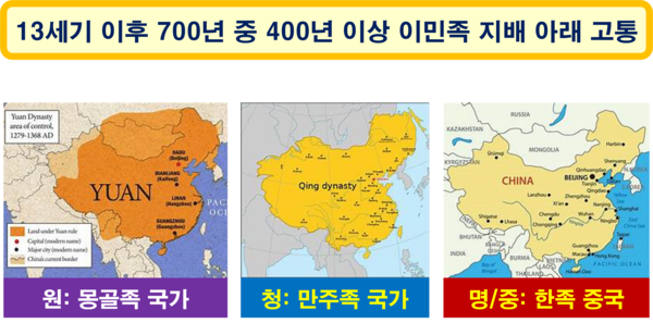 원나라 몽골족의 중국 지배가 시작된 1279년부터 영국의 홍콩 지배가 끝난 1977년까지 698년 동안, 원나라의 중국 지배 89년(1279~1368), 청나라의 중국 지배 267년(1644~1911), 영국의 홍콩 지배 65년(1912~1977), 일본의 만주 지배 13년(1932~1945) 등 총 434년 동안 이민족의 지배를 받았다.