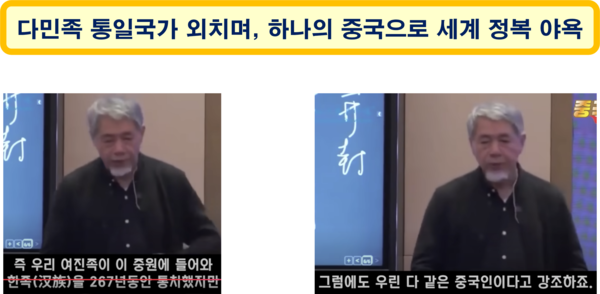 왕 교수는 “(한국 학자들에게) 나는 원래 여진족(; 1635년 만주족)의 후손입니다. 우리 여진족이 중원(中原)에 들어와 한족을 267년(1644~1911) 동안 통치했지만, 그럼에도 우리는 다 같은 중국인이다고 강조하죠.”라고 말했다. 이처럼 중국은 한족을 지배했던 민족이나 소수 민족에 대한 견제와 차별을 병행하며 다민족 통일국가라는 구호 아래 국내 세력을 결집함으로써 세계 정복의 야욕을 키워가고 있다.