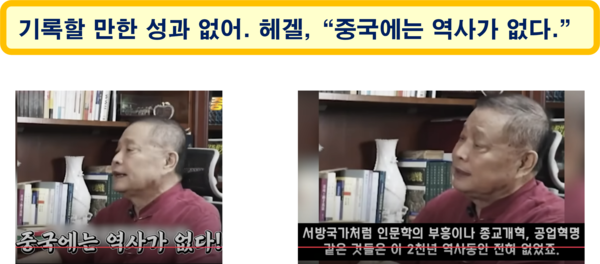 중국의 한 퇴직 교수는 ‘(중국 대륙에는) 2천년 동안 서방국가처럼 인문학의 부흥이나 종교개혁, 공업혁명과 같은 것들이 전혀 없었습니다. 그러니 독일의 철학자 헤겔(Hegel)이, 이런 의미에서,“중국에는 역사가 없다.”고 한 것입니다.’고 했다. [원문 출처: (유튜브) 중국 반응│중국은 사실 역사가 없는 민족입니다! ]