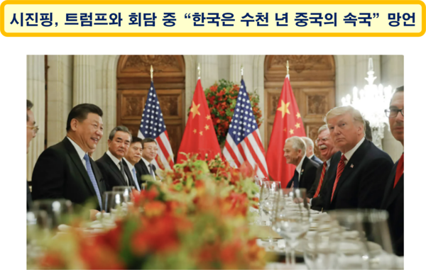 오늘날 중국의 동북 지방으로, 요령성/길림성/흑룡강성 및 내몽고 자치구의 동부지역을 포괄하는 지역인 만주 지역이 한민족의 영토였다는 공산당 두 핵심 지도자의 발언은 모택동과 주은래의 접견 외빈담화기록에 버젓이 남아있지만, 현재의 중국 공산당은 이를 철저히 숨기려 하고 있다. 2013년 집권한 시진핑은 2017년 트럼프와의 미/중 정상회담을 가졌다. 정상회담을 위해 비행기를 타고 태평양 위를 지나던 중에 시진핑은 태평양이 넓다며, 태평양을 양분하여 반은 중국이, 나머지 반은 미국이 지배하는 게 좋겠다는 망언을 한 것으로 전해지고 있다. 미/중 정상회담 때에는 “한국은 수천 년간 중국의 속국이었다.”고 말하며 한국을 흡수하려는 공작을 벌이고 있다. 이런 망언을 한 것은 아시아 역사를 제대로 알지 못하거나, 1953년생인 시진핑이 세뇌 교육을 받은 영향일 수도 있다. 어쨌든 시진핑의 의도는 한반도가 수천 년 동안 중국의 속국이었으니, 이제부터라도 미국이 한반도로부터 손을 떼라는 말을 전하기 위함이었을 것이다.