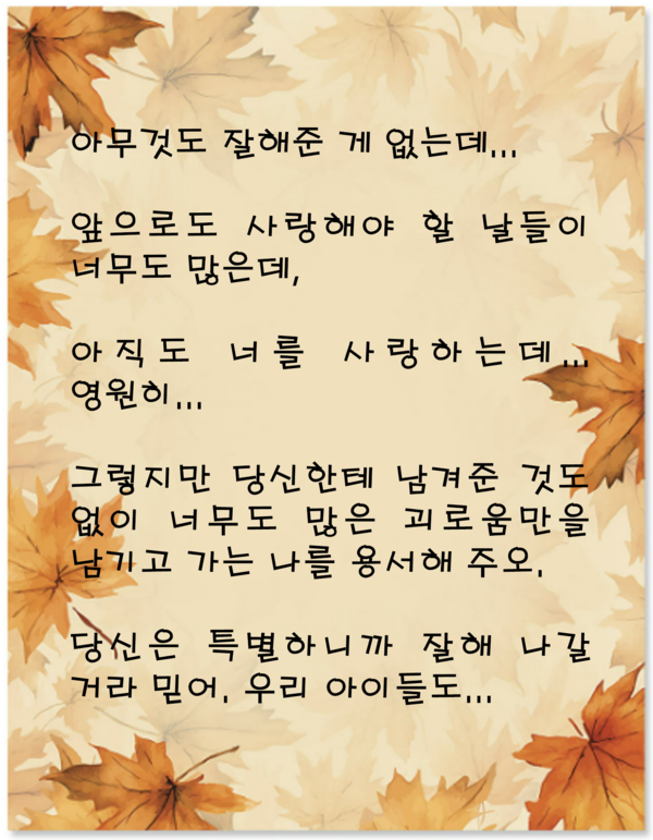 “당신하고 우리 사랑스런 아이들을 남겨 놓고 떠난다는 게 너무 가슴 아파. 아무것도 잘해준 게 없는데...”