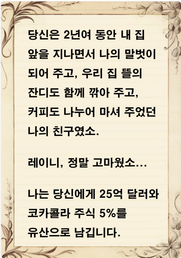 “나는 당신에게 25억 달러와 코카콜라 주식 5%를 유산으로 남깁니다.”
