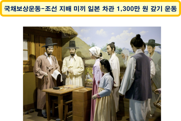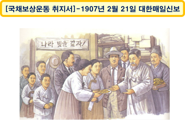 국채 보상 운동(國債報償運動)은 일본 제국이 대한제국을 경제적으로 예속시키고자 제공한 차관(借款) 1,300만 원을 국민들이 갚고자 한 운동으로, 김광제, 서상돈 등이 제안하였다. 1907년 2월 경상북도 대구에 있는 국채보상운동기념공원을 중심으로 해서 김광제, 서상돈, 윤필오 등에 의해 처음 시작되어 전국으로 번져나갔다. 그러나 조선통감부가 대한매일신보 창간자인 베델(Bethell)이 모금액 중 2만 원을 사적으로 투자했다가 원금을 받지 못했다는 괴소문을 퍼뜨리는 등 방해를 일삼으면서 운동은 소멸되고 말았다. (이상 원문 : 위키백과. 그림 : 전혁진의 역사 새로 읽기, 시사N라이프)