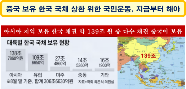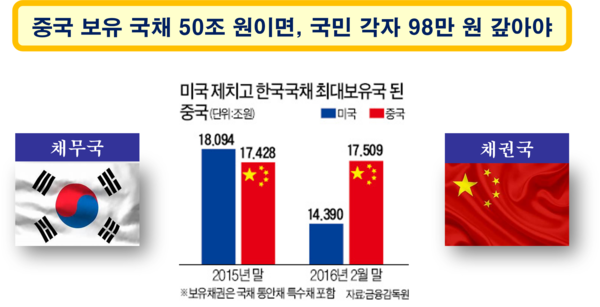 중국 등 아시아 국가들의 한국 국채 보유액 138조 7,860억 원 중 중국의 한국 국채 보유액을 정확히 알 수 없는 상황이지만, 최저 30조 원에서 최대 100조 원 이상이라는 언론인도 있다. 2016년 2월 말 기준 중국의 한국 국채 보유액이 17조 5,090억 원이라는 통계 이후 신뢰할 수 있는 정보가 없는 실정이지만, 만약 중국의 한국 국채 보유액이 50조 원이라면 5,115만 명 우리 국민이 각자 98만 원의 국채를 중국에 갚아야 한다는 뜻이다. 나아가 중국의 한국 국채 보유액 50조 원에 국채 수익률 연 3%를 적용하면 매년 1조 5천억 원이 한국에서 중국으로 이동하게 된다. (이상 원문 : 2025.09.29. 조선일보. 그림 : 조선일보, 한국경제)