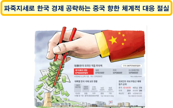 중국이 한국을 흡수하려는 의도는 중국 정부의 공식적인 입장은 아니지만, 공공연한 사실로 인식되고 있다. 중국 정부는 비밀리에 수많은 인민들을 세뇌(洗腦)하여 한국을 흡수하려는 전략을 소프트 파워(soft power) 전쟁의 형식으로 수행하고 있다. 지금이야말로 우리 국민이 국채보상운동을 하는 절박한 심정으로 달러를 절약하는 한편, 한국에 대한 중국의 경제적 침투를 적극적으로 견제하면서 중국이 보유한 한국 국채를 줄이는 데 힘을 모아야 할 때이다. (그림 : 2025.09.29. 조선일보)