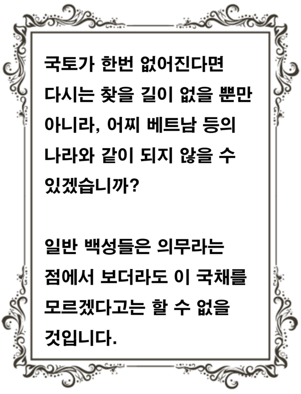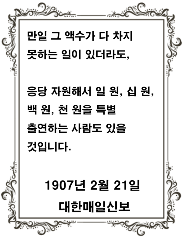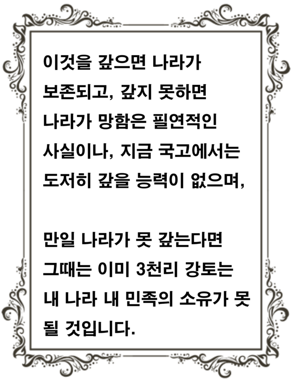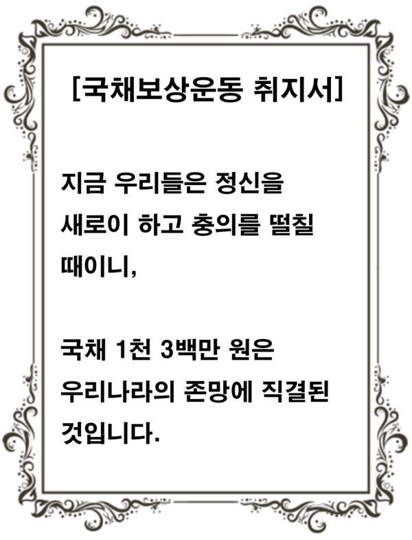 “국채 1천 3백만 원은 우리나라의 존망에 직결된 것입니다. 이것을 갚으면 나라가 보존되고 갚지 못하면 나라가 망함은 필연적인 사실이나...”