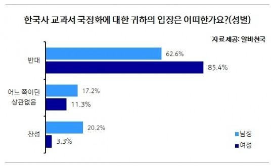 아르바이트 전문 포털 알바천국(대표 최인녕)은 오는 12일 수능을 앞둔 전국 18~21세 남녀 수험생 320명을 대상으로 ‘한국사 교과서 국정화’에 관한 설문을 진행한 결과, 78.2%가 ‘국정화를 반대한다’고 응답했다고 4일 밝혔다. ‘어느 쪽이던 상관없다’는 13.1%, ‘찬성’은 8.7%에 그쳤다.
