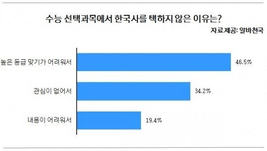 한편, 수능 선택과목으로 ‘한국사’를 선택한 수험생 비율이 2005년도(27.7%) 이후 작년(7.3%)까지 10년간 20.4% 감소한 가운데(교육부 발표), 한국사를 선택하지 않는 가장 큰 이유로 ‘높은 등급을 맞기 어려워서’(46.5%)가 1위를 차지한 것으로 나타나 눈길을 끌었다.