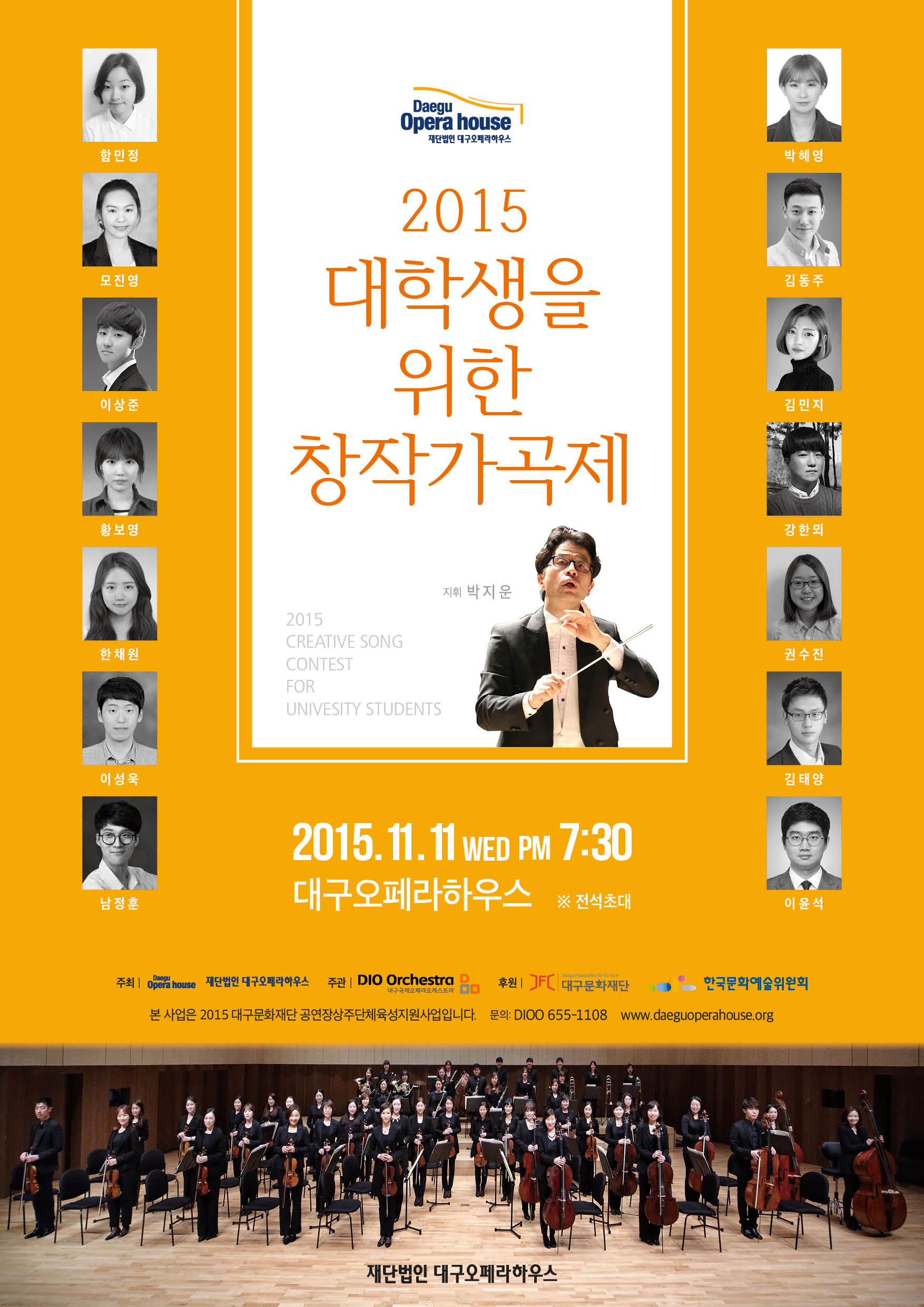 ‘제1회 대학생을 위한 창작가곡제’ 공연은 11월 11일 오후 7시 30분 대구오페라하우스에서 열리며, 무료로 입장 및 관람이 가능하다. 문의는 대구오페라하우스 공연사업팀(053-666-6041)으로 하면 된다.